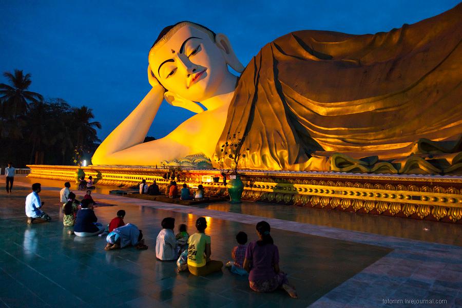 Статуя имеет сто восемьдесят футов длины и сорок семь футов вышины до оконечности плеча. Правительство устроило над нею навес, который, разумеется, защищает ее, но, к сожалению, портит общий эффект и почти не дает возможности судить о ее колоссальных размерах. Восторженное поклонение частных лиц превратило просто сложенную кирпичную фигуру, первоначально найденную, в блестящее доказательство горячей веры, распространенной в стране. Так, например, подошвы ног статуи были украшены очень дорого стоившей бирманской стеклянной мозаикой.
