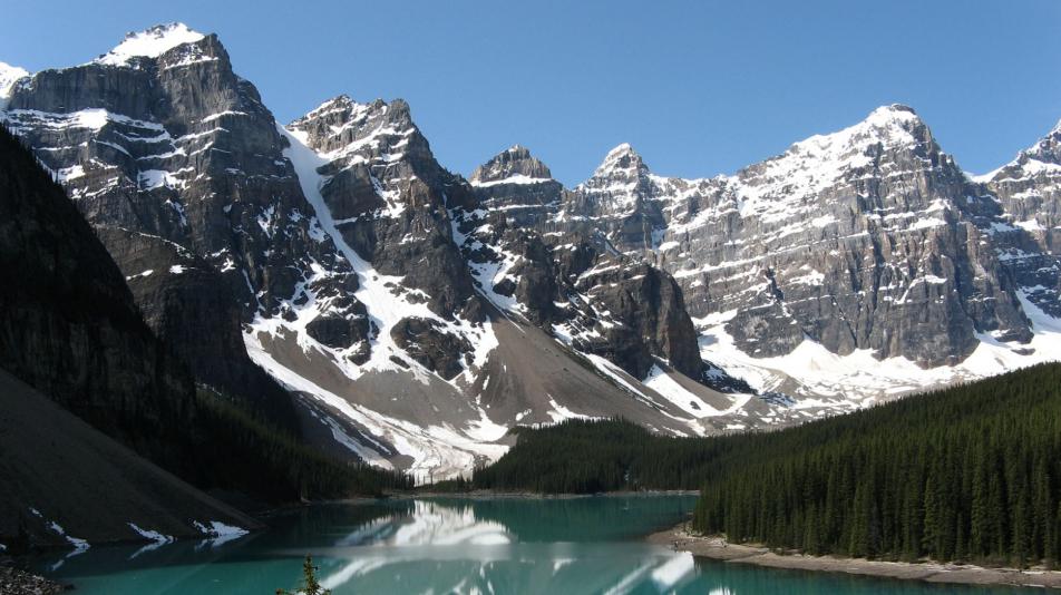 Так, у подошвы огромного ледника лежит озеро Луизы, и в его глубоких, безмятежных водах отражаются красоты окружающей природы: высокие пики, увенчанные снегом, темные скалы и зеленые сосновые леса, сливающиеся с голубым небесным сводом, раскинутым над ними в вышине.