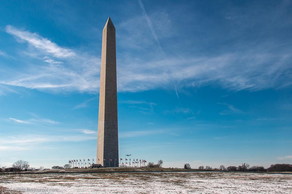 Одним из известнейших в мире обелисков является колонна, воздвигнутая в Соединенных Штатах Джорджу Вашингтону, «отцу своей страны» и ее первому президенту в городе, который также носит его имя, столичном городе республики. Он имеет пятьсот пятьдесят футов высоты и строился в продолжение тридцати семи лет. Место для него было выбрано самим президентом Вашингтоном. Фундамент был заложен в 1848 году, а вершина, коническая глыба американского алюминия, была утверждена на месте в 1884 году. Нижняя часть монумента построена из новоанглийского гранита, облицованного кристаллическим мрамором; верхняя часть из чистого белого мрамора. На вершину можно взобраться с помощью подъемной машины или по лестнице в девятьсот ступеней. Справедливо и хорошо было сказано, что «благородство, соразмерность и необыкновенная высота характера Вашингтона, каким он представляется теперь уму его сограждан, превосходно выражены в его простом величественном монументе».
